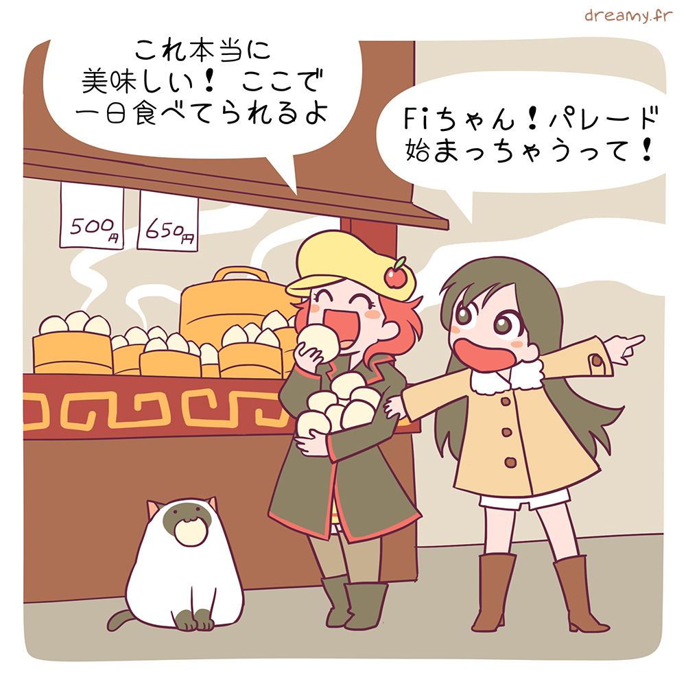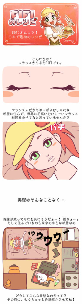 Fifi est française et végétarienne. Ses passions : la cuisine et le voyage. Là voilà au Japon pour un an et chaque semaine, elle revisite les grandes recettes classiques et internationales… version nippone ! Entourée de sa nouvelle meilleure amie Naoko et de son gros chat Mimi, elle découvre la culture japonaise au fil des saisons : 52 strips et 52 recettes à lire (et à déguster).